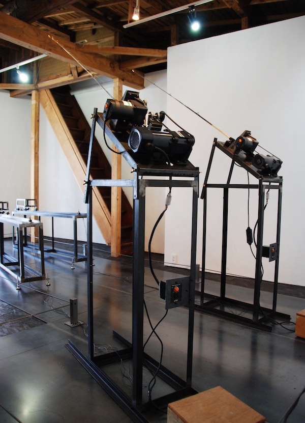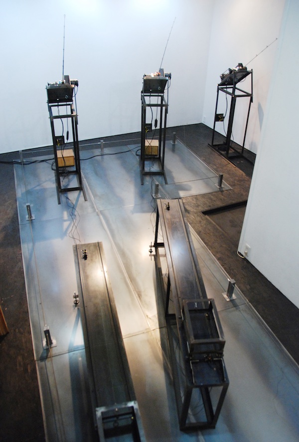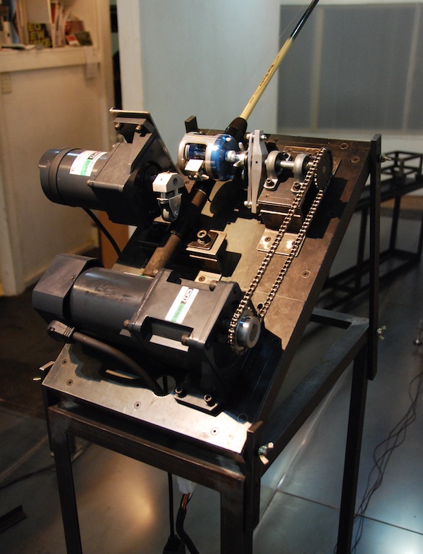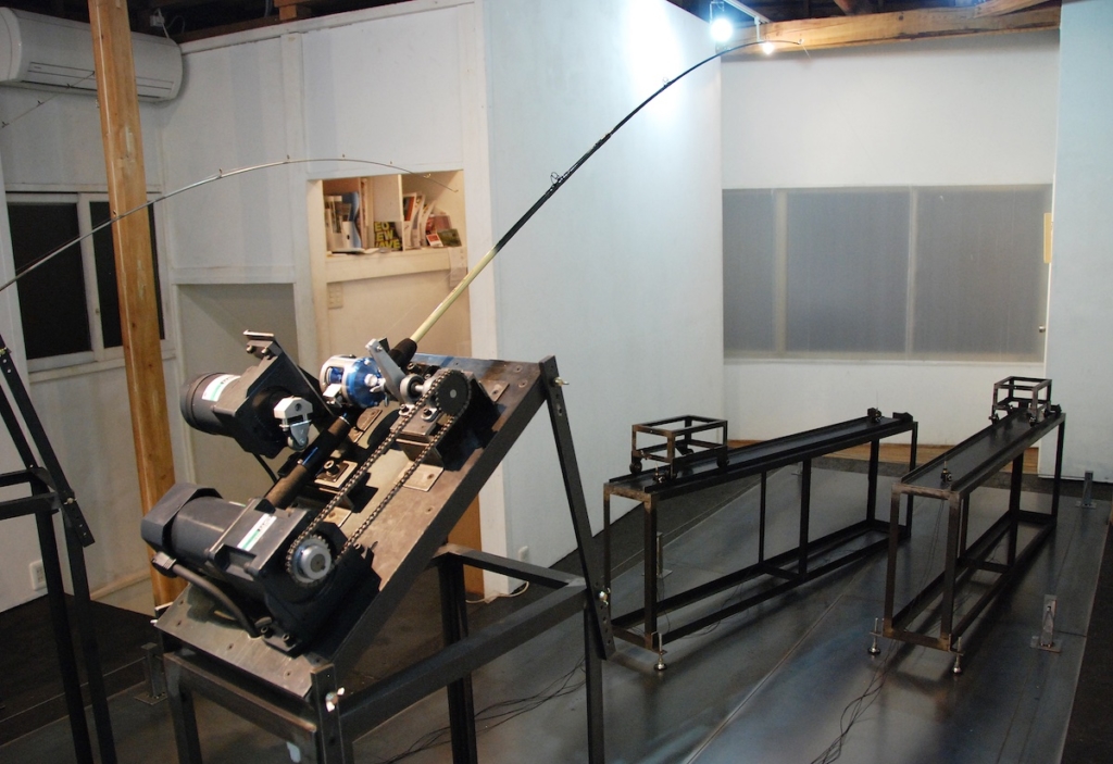 2008年に続きArt Center Ongoingでは2回目となるタムラサトルの個展『キャッチ アンド リリース』。タイトルは釣りの用語で、釣った魚を食べたり持って帰ったりせずに直ぐに逃がすことをさすのだが、本展ではリールのついた竿が3本設置されておりそれぞれモーターを使って自動で糸を巻き取る仕組みになっていた。糸の先には車輪のついた鉄の黒い構造物が繋がれており、リールが糸を巻くとジリジリとそれがこちらに近づいてくる。その構造物がある一点まで辿り着くと、リールは巻くことをやめ糸をリリースする。構造物はゆっくりと後退していき端で止まる。それからまたリールは糸を巻き上げ、竿は糸が巻かれる間だけしなり続ける。初めから最後まで、ただその繰り返し。それ以上でもそれ以下でもない、機械による無情な反復運動。にもかかわらず、観るものを惹きつけてやまないタムラのマシーン(作品)。