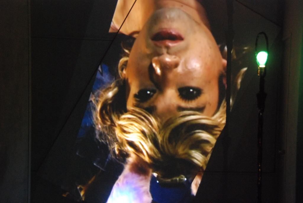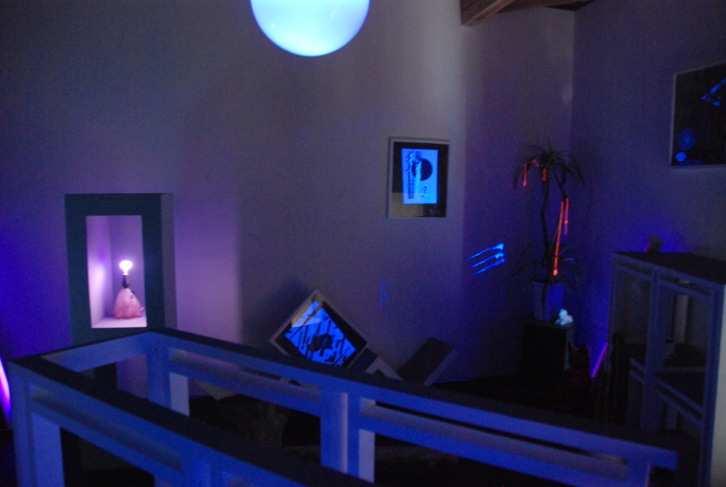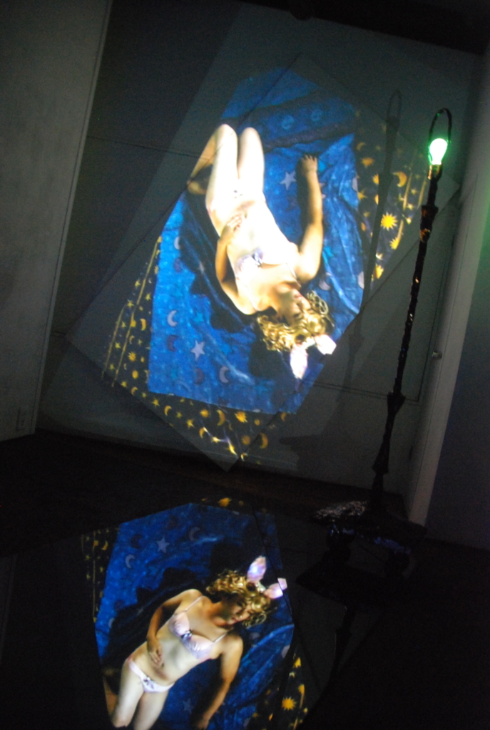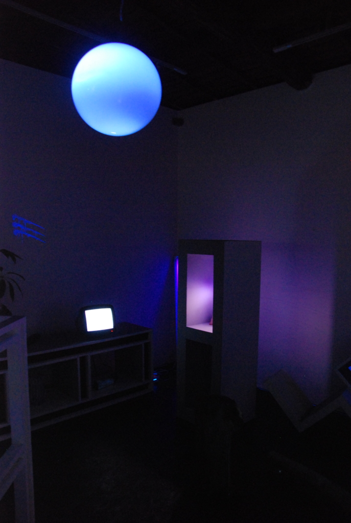 アーティスト・ラン・スペース「XYZcollective」の共同ディレクターとしても活動するアーティストのCOBRAによる、Art Center Ongoingでは初の個展『Goldilocks and the Three Bears』。牙の形をした入り口をくぐり階段を上ると2階のギャラリーはブラックライトで照らしだされている。会場には棚や照明やテレビなどが設置されリビングルームのよう。ただしところどころ蛍光色に光るオブジェやドローイングが設置され、不穏な雰囲気が漂う。会場の奥には鏡が敷かれ壁には下着を着けた金髪の女性が寝ている姿が映し出される。よく見れば女性に扮しているのはCOBRA。本展で題材としたのは童話「3びきのくま」だという。女の子が森でクマの家を見つけそこに入って、お粥を食べて、椅子にすわり、ベッドで眠ってしまう。そこにクマが戻ってきて、目覚めた女の子は逃げ出すというストーリー。本展では、映像で寝ている女の子(COBRA)が目を覚ますのと同じくして、会場には爆音で音楽が流れ出す。物語性を孕んだ奇天烈【ルビ:きてれつ】インスタレーション。