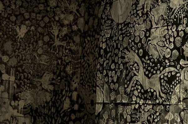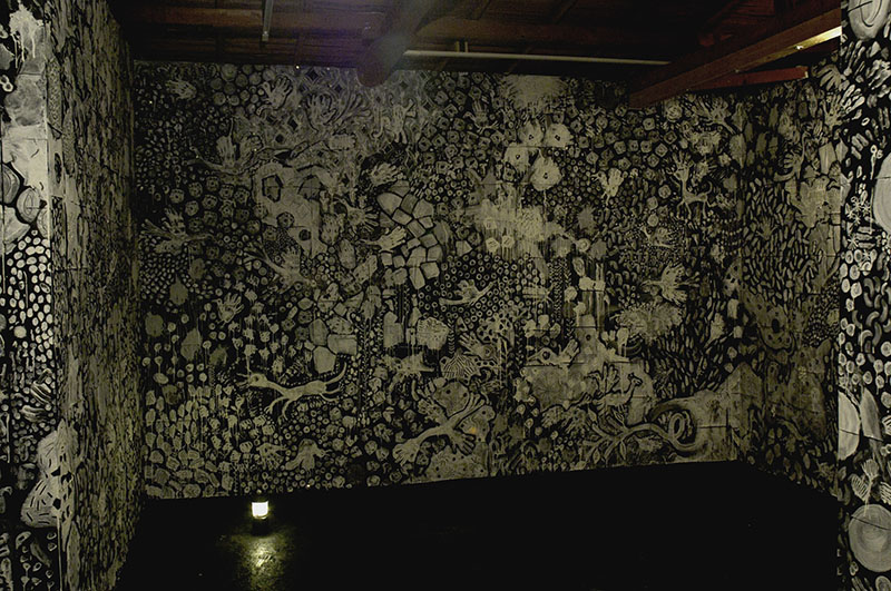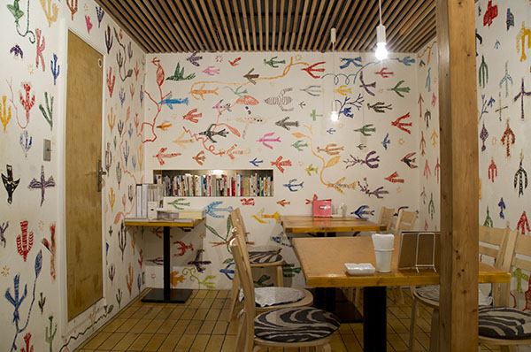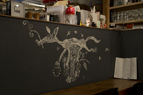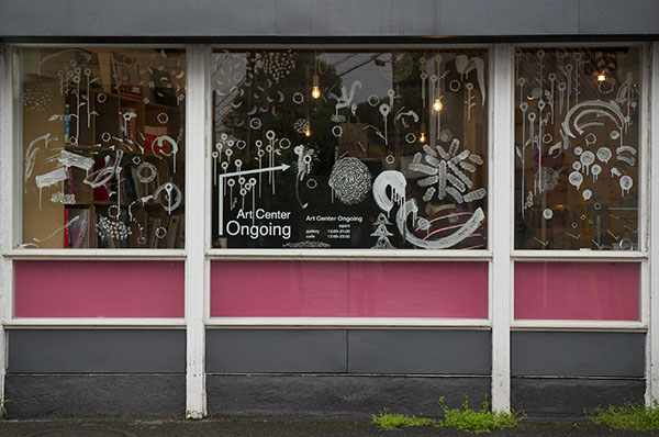 Art Center Ongoingでは3年ぶりとなった淺井裕介の個展『草の実』。マスキングテープとマジックで描く「マスキングプラント」、そして泥を絵の具として描く「泥絵」で知られる淺井。本展示では、小麦粉と水だけを素材として用いた新シリーズを発表。2階ギャラリーの壁は、A4サイズの黒い紙で全面覆われ、そこに小麦粉を絵の具とした白い絵が描かれている。四足歩行の獣や様々な種類の鳥、草や木や植物、そして月や太陽あるいは水や風の流れを思わせる模様など、壁面は隙間なく淺井の白い絵画で埋め尽くされる。光源は最小限に抑えられ、洞窟の中で太古に描かれた壁画に対面しているかのよう。来場者には手持ちのランタンが渡され、壁面の近くに寄ったり引いたりながらじっくりと時間をかけて作品を鑑賞していた。1階の壁には淺井のマスキングテープを使ったワークショップから生まれた色とりどりの鳥、また道路側の窓には小麦粉のドローイングも多数描かれた。なお本展で小麦粉を使い淺井が描いた動物の絵は、現在でも1階カウンターに残ってお客さんを迎え入れてくれる。