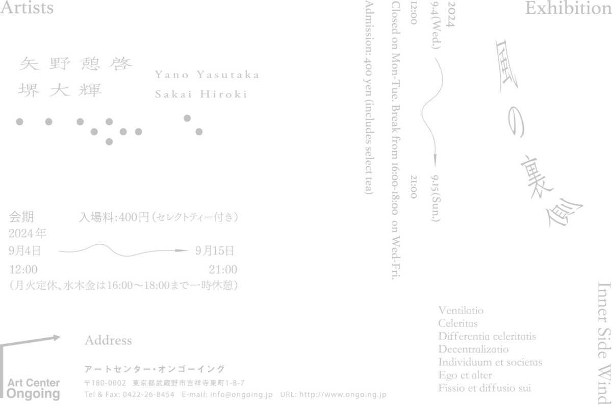 この度、Art Center Ongoingでは、堺大輝(さかいひろき)と矢野憩啓(やのやすたか)による二人展「風の裏側」を開催します。