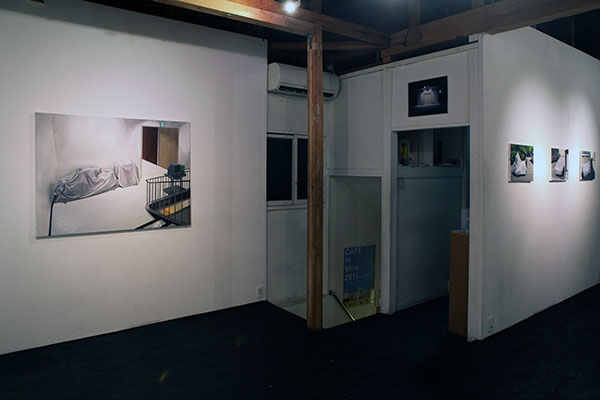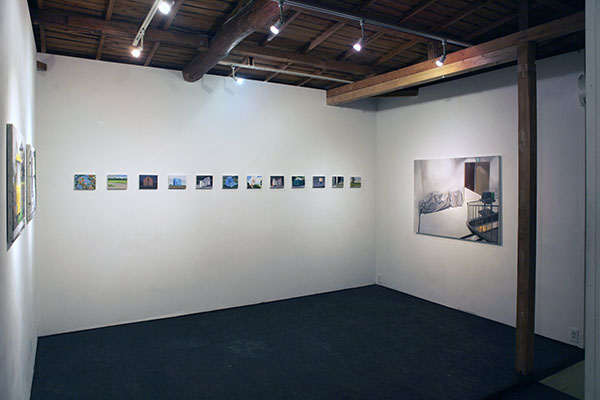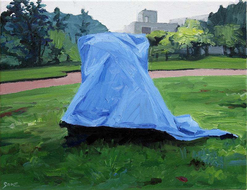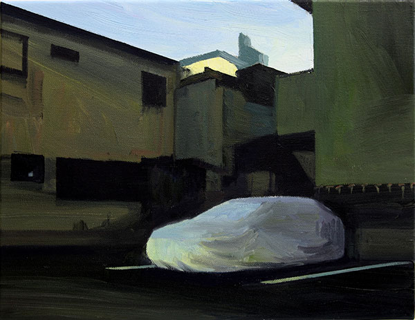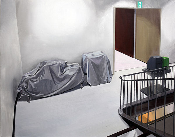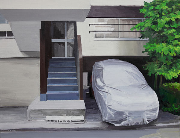 球体や額縁など様々な変形の支持体に風景画を描くことで広く知られる鮫島大輔。Art Center Ongoingでは3年ぶりとなる本展『Terror』では鮫島が得意とする変形の支持体は登場せず、四角いキャンバスのペインティング作品が並んだ。そこに描かれていたのは、ブルーシートやシルバーのカバーなどに包まれた何か。シートの下から見える車輪やその輪郭などから、内側にあるのは車や台車であることは想像できるが、だがしかし、はっきりはしない。駐車場を始め、階段の踊り場や空き地など、日常を切り取った風景の中の、カバーに包まれた何か。「恐怖」を意味する展示タイトルが示唆するように、鮫島が今回切り取った風景には、どこか不穏な空気が流れていて、この先に何かが起こりそうな、あるいはそこで何かがあったかのような、非日常へとつながる日常が四角い画面に定着しているのだった。鮫島の新境地が垣間見えた展覧会。