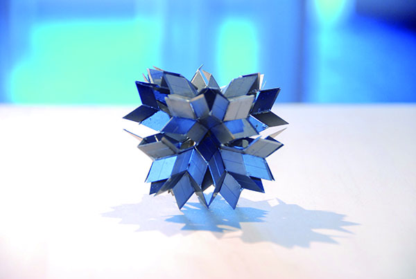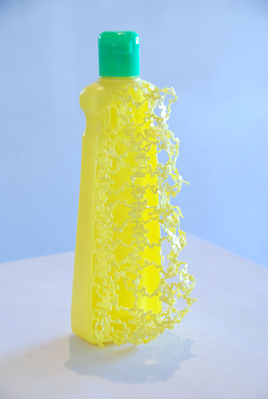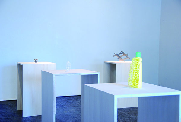 2010年の2人展を経て、Art Center Ongoingでは初の個展となった伊佐治雄悟による『イサジパターン』。本展では、コンタクトの洗浄液の空ボトルや洗剤の空ボトルなどのプラスチック製品をカッターで同じ形状で細かく切り裂いていく作品、カッターの歯をはんだ付けして作りあげた作品など、私たちが日常生活でよく目にする既製品に手を加えることで生みだされた彫刻作品を発表。「あー、あれから作っているのね」と、誰もが素材のもとの姿を容易に想像できるのであるが、よくよく見てみると気の遠くなるような作家による手作業の集積がみえてくる。ただし伊佐治作品の多くは、その膨大な作業量を主張するわけではなく、もう少しスマートに、あるいは、もともとがその姿であったかのように、凛として存在している。近年、既製品を使いイリュージョンを作り上げる作家は数多くいるが、既製品が変形され新しい様相を呈しながら、なお既製品であり続けているところが伊佐治作品のオリジナリティーなのだろうか。プラスチックな美。