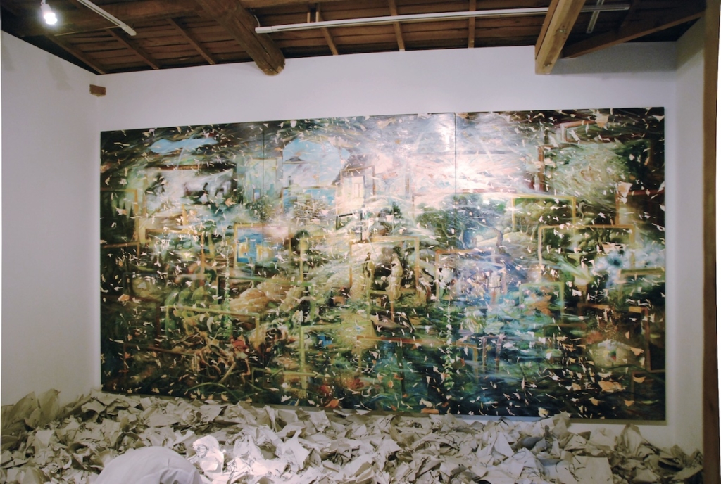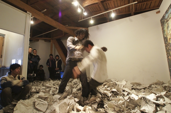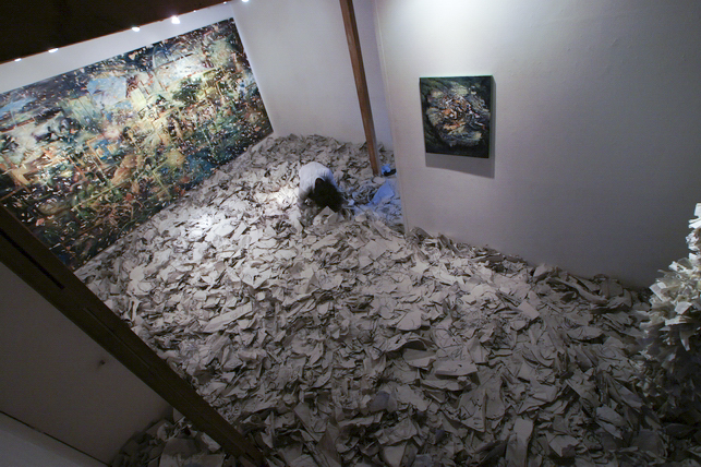 インターネット等で収集した様々なイメージを組み合わせ、油絵の具を使い唯一無二の平面作品を描く今津景と、自らの身体を用いて体力の限界を超えたパフォーマンスを繰り広げる村田峰紀。異色の組み合わせとなった2人の展示『カルチャー』。表現方法は違えども、2人は同時期に多摩美術大学を卒業した旧知の仲で、本展で発表した作品に関して作品イメージのコンセンサスは取れていたのかもしれない。今津は巨大なキャンバスに嵐の吹き荒れる情景を描きだした。その画面には、無数の塵が舞いただならぬ躍動感がみなぎっている。その巨大なキャンバスを背景に、村田は会期中ほぼ毎日パフォーマンスを行った。会期の初日、A4サイズの大量の紙がギャラリーの床に設置され、村田はその上に乗り黒いマジックで円を描き始めた。「うんうんうんうん」という村田からわきあがる唸り声とともに、黒い円のドローイングは増殖していく。会場は日に日にドローイングの紙で埋め尽くされていく。ふと今津の絵画に目を移せば、その中に村田を思わせる一人の男が描かれていて、かれもまた絵の中でドローイングをし続けているのだった。絵画とパフォーマンスの稀代の邂逅。